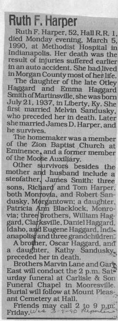 | Survived By | Husband; mother; stepfather, James Smith; 3 sons, Richard and Tom Harper, and Robert Sandusky; daughter, Patricia Ann Blacklock; 3 brothers, William, Daniel, and Eugene Haggard; 3 grandchildren. (A brother and a daughter are deceased.) |