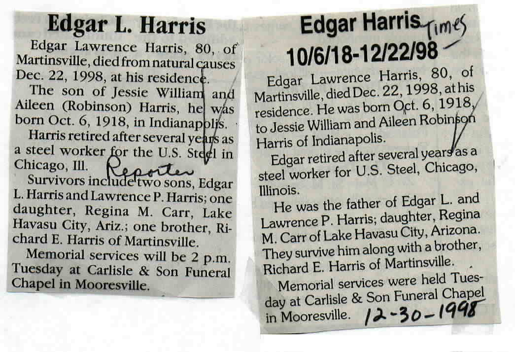 | Obituary Source | Mooresville Times, Dec. 30, 1998 |
