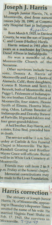 Other Age 74. Carlisle Chapel (Rev. Randall Gearing and Bro. Wayne Grace officiating.) Parents: Joseph C. and Cassie Hadley Harris. Died at Community East; born in Daviess Co.