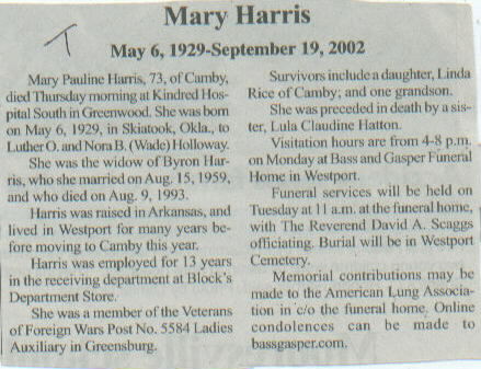 | Other | Born in Skiatook, Okla., to Luther O. and Nora B. (Wade) Holloway. Preceded in death by a sister, Lula Claudine Hatton. |
