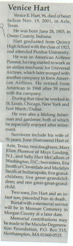 | Other | Age 96. Two sons, Jim Hart and an infant son, preceded him in death. |