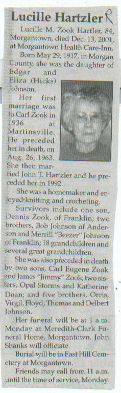 Other Preceded in death by both husbands; parents, Edgar and Eliza (Hicks) Johnson; sons, Carl Eugene and James Zook; sisters, Opal Storms and Katherine Doan; brothers, Orris, Virgil, Floyd, Thomas, and Delbert Johnson.