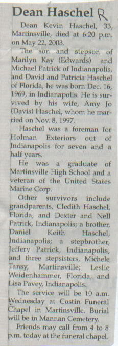 | Survived By | Widow; parents and stepparents, Marilyn Kay (Edwards) and Michael Patrick, and David and Patricia Haschel; grandparents, Cledith Haschel, and Dexter and Nell Patrick; brother, Daniel Keith Haschel; stepbrother, Jeffery Patrick; 3 stepsisters, Michele Tansy, Leslie Weidenhammer, and Lisa Pavey. |