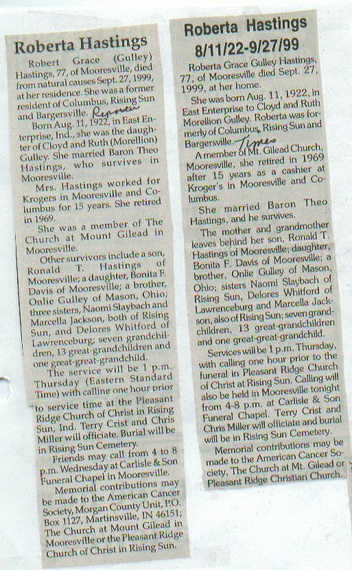 | Other | Age 77. Carlisle funeral at Pleasant Ridge Church of Christ in Rising Sun, Ind. (Rev. Terry Crist and Chris Miller officiating.) Buried Rising Sun cemetery. Parents: Cloyd and Ruth Morellison Gulley. Died at her home. |