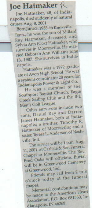 Survived By Spouse; mother, Sylvia Ann (Cox) Hatmaker; sons, Daniel Ray and Darren James Hatmaker; brother, Timothy R. Hatmaker; sister, Teresa L. Anderson.