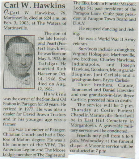 Survived By Daughter, Virginia Holsapple; 2 brothers, Charles and Joseph Hawkins; granddaughter, Joni Carlisle; great-grandson, Bryce Carlisle.