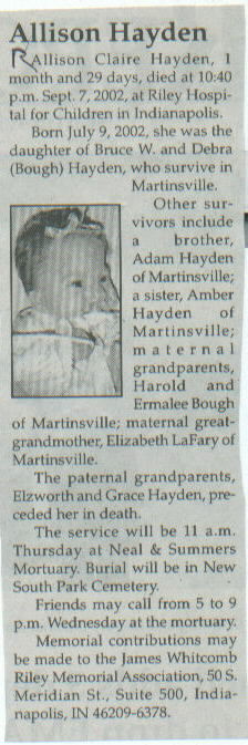 | Survived By | Parents, Bruce W. and Debra (Bough) Hayden; brother, Adam Hayden; sister, Amber Hayden; grandparents, Harold and Ermalee Bough; maternal great-grandmother, Elizabeth LaFary. |