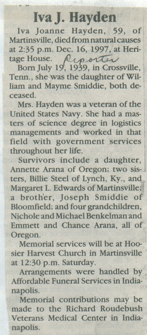 Survived By Son, Leigh Hayden; 8 grandchildren; 14 great-grandchildren.
