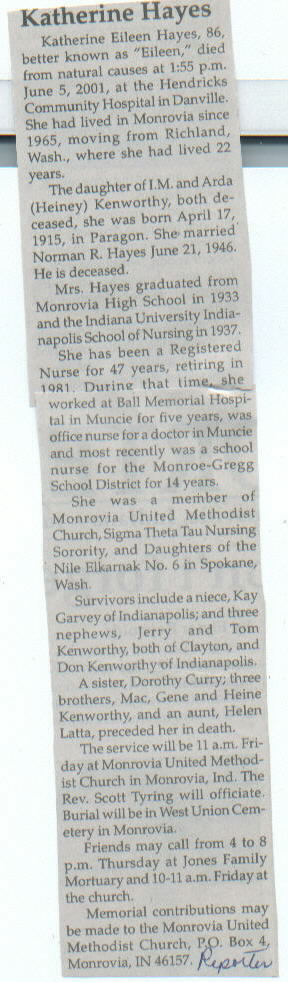 | Other | Preceded in death by parents, I. M. and Arda (Heiney) Kenworthy; brothers, Mac, Gene, and Heine Kenworthy; sister, Dorothy Curry; aunt, Helen Latta; spouse. |