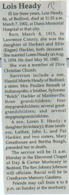 | Other | Preceded in death by a son, Loren E. Heady; a daughter who died in infancy; three brothers, Luther, John L., and Pat Hackler; and two sisters, Mary Greathouse and Bertha Bough. Parents: Herbert and Effie (Eagan) Hackler, both deceased. |