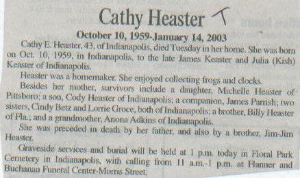| Survived By | Mother, Julia (Kish) Keaster; daughter, Michelle Heaster; son, Cody Heaster; companion, James Parrish; 2 sisters, Cindy Betz and Lorrie Groce; brother, Billy Heaster; grandmother, Anona Adkins. |