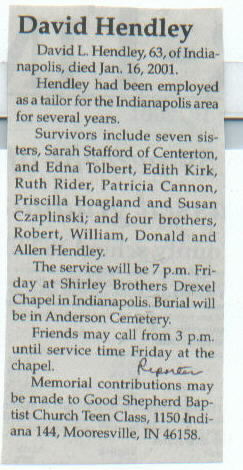 Survived By Sisters, Sarah Stafford, Edna Tolbert, Edith Kirk, Ruth Rider, Patricia Cannon, Priscilla Hoagland, and Susan Czaplinski; brothers, Robert, William, Donald, and Allen Hendley.