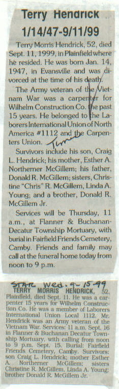 | Survived By | Son, Craig L. Hendrick; mother, Esther A. Northerner McGillem; father, Donald R. McGillem; sisters, Christine R. McGillem and Linda A. Young; brother, Donald R. McGillem, Jr. |