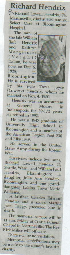 | Survived By | Widow; 2 sons, Richard Lowell Hendrix II and William Paul Hendrix; daughter, Julie Ann Hendrix; granddaughter, Lakina Treva Marie Williams. |