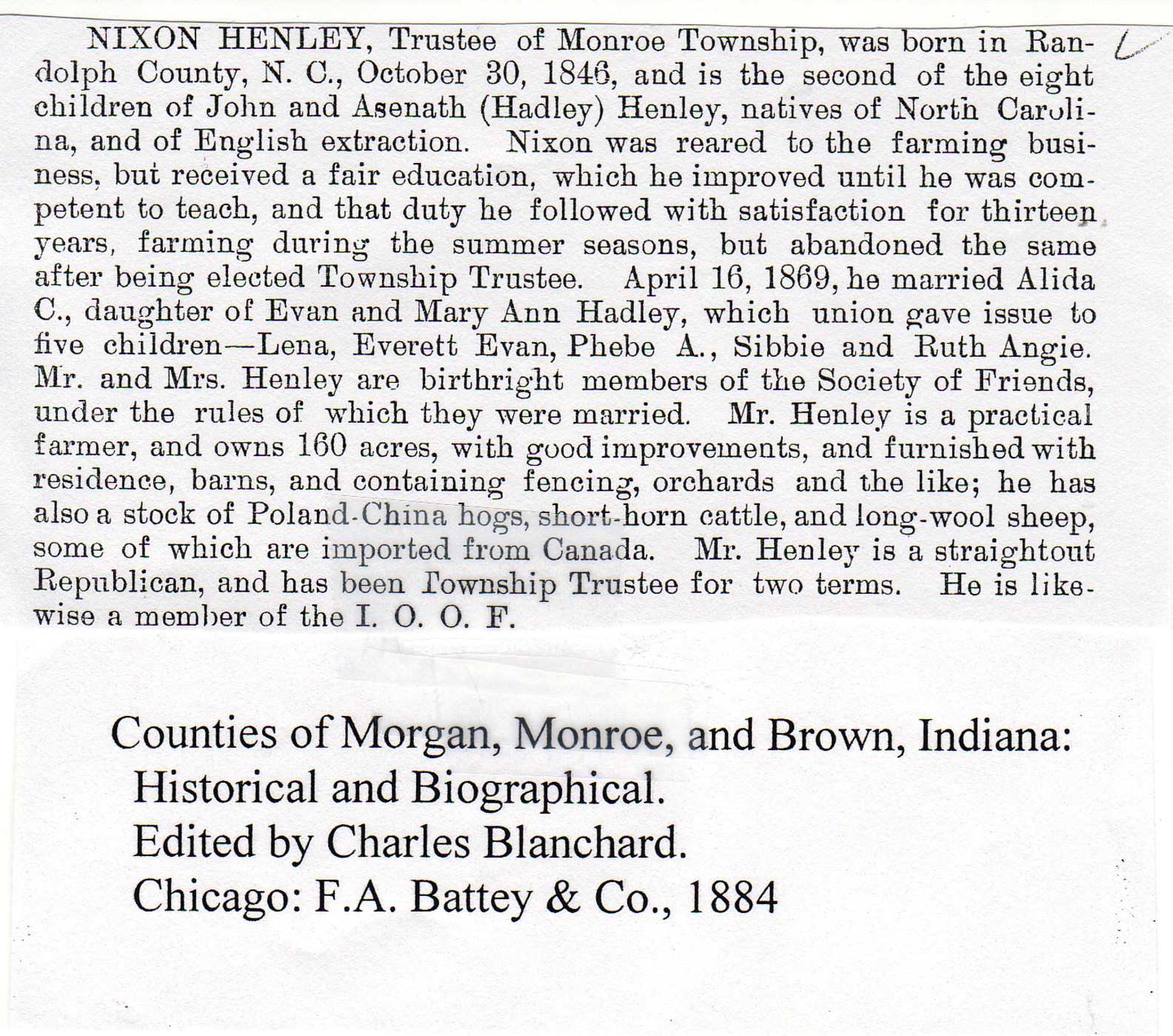 | Other | Age 76. Born in Randolph Co., N.C. Parents: John and Asenath (Hadley) Henley. Married Alida Hadley on April 16, 1869; they had 5 children: Lena, Everett Evan, Phebe A., Sibbie, and Ruth Angie. None of the children ever married. |