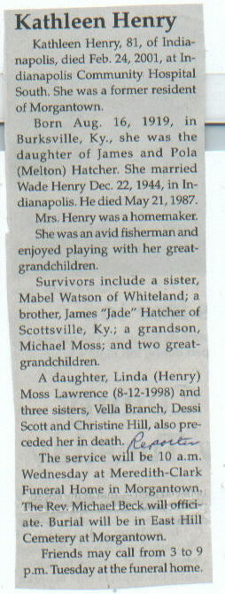 | Other | Preceded in death by spouse; parents, James and Pola (Melton) Hatcher; daughter, Linda (Henry) Moss Lawrence; sisters, Vella Branch, Dessi Scott, and Christine Hill. |