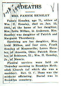 | Survived By | Daughter, Mrs. Erwin Milhon of Anderson; 4 sons, Frank, Loren of Ansonia, Ohio, Patrick of Robinson, Illinois, and William H. Hensley, Jr. of Muncie. |