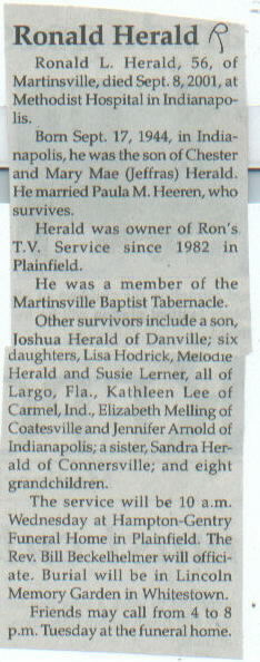 | Survived By | Son, Joshua Herald; daughters, Lisa Hodrick, Melodie Herald, Susie Lerner, Kathleen Lee, Elizabeth Melling, and Jennifer Arnold; sister, Sandra Herald; 8 grandchildren; spouse. |