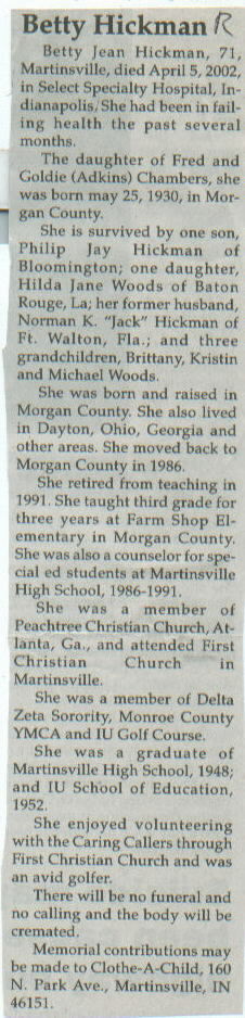 | Survived By | Son, Philip Jay Hickman; daughter, Hilda Jane Woods; former husband, Norman K. "Jack" Hickman; 3 grandchildren, Brittany, Kristin, and Michael Woods. |