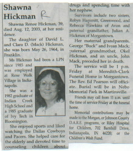 | Survived By | Parents, David L. and Clara D. (Mack) Hickman; 2 sisters, Robyn Hammitt and Rebecca Hawkins; paternal grandfather, Julian A. Hickman. |