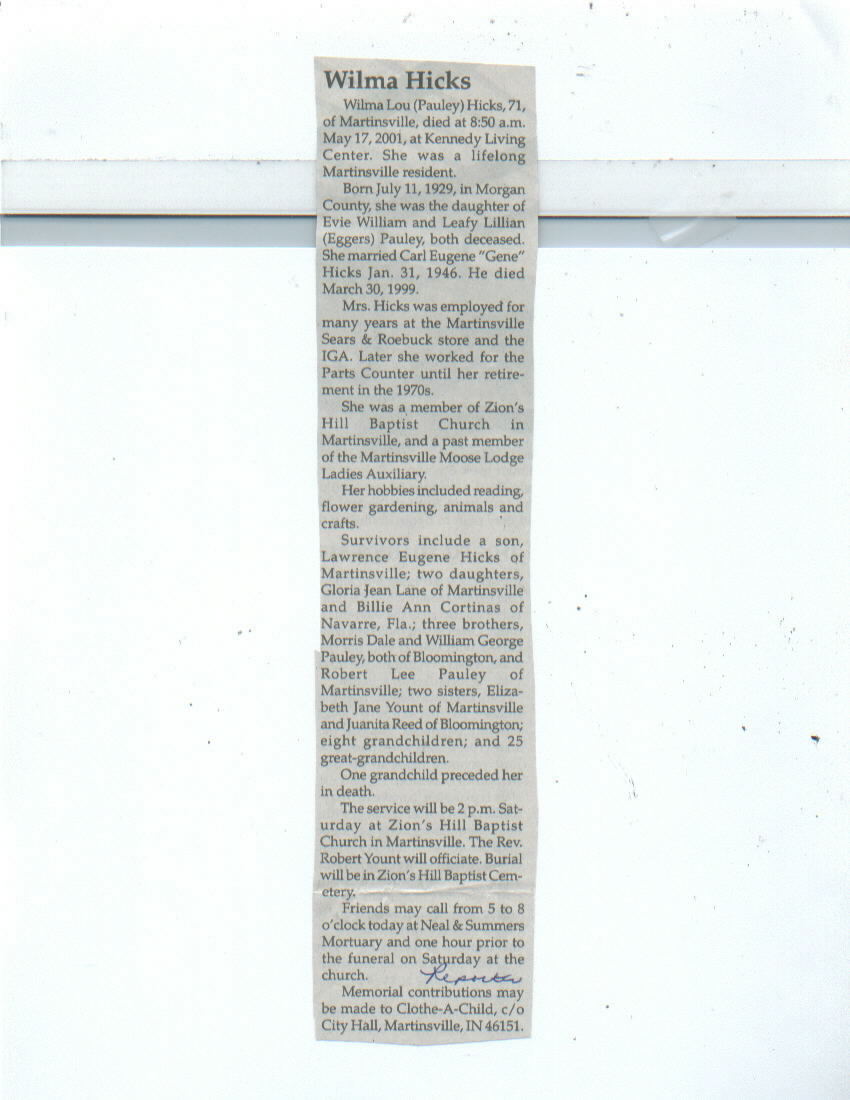 Survived By Son, Lawrence Eugene Hicks; daughters, Gloria Jean Lane and Bilie Ann Cortinas; brothers, Morris Dale, William George, and Robert Lee Pauley; sisters, Elizabeth Jane Yount and Juanita Reed; 8 grandchildren; 25 great-grandchildren.