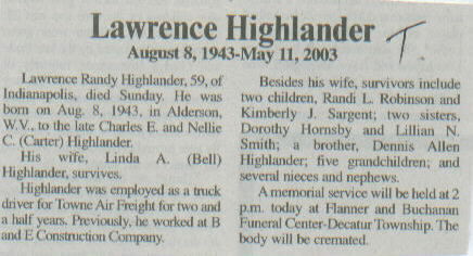 | Survived By | Widow; 2 children, Randi L. Robinson and Kimberly J. Sargent; 2 sisters, Dorothy Hornsby and Lillian N. Smith; brother, Dennis Allen Highlander; 5 grandchildren; several nieces and nephews. |
