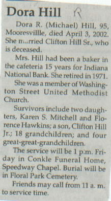 | Survived By | Two daughters, Karen S. Mitchell and Florence Hawkins; son, Clifton Hill, Jr.; 18 grandchildren; 4 great-great-grandchildren. |