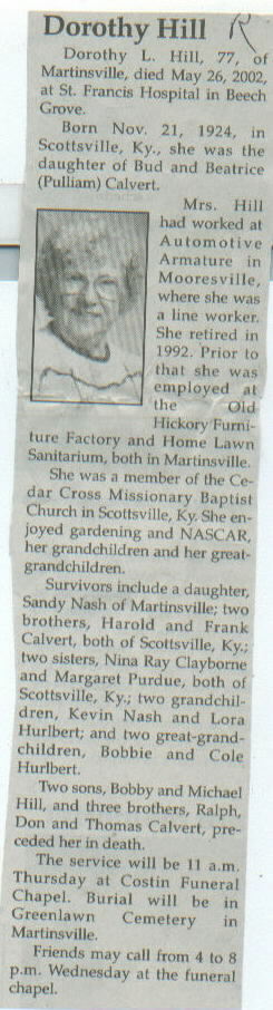 | Other | Preceded in death by two sons, Bobby and Michael Hill, and three brothers, Ralph, Don, and Thomas Calvert. |