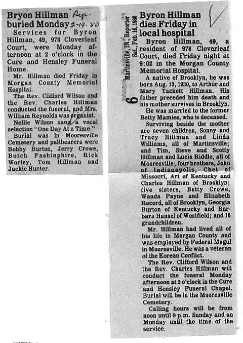 | Survived By | Mother, Mary Tackett Hillman; sons, Sonny, Tracy, Tim, Steve, and Scotty Hillman; daughters, Linda Williams and Lucie Riddle; brothers, John, Chet, Art, and Charles Hillman; sisters, Betty Crowe, Wanda Payne, Elizabeth Record, Georgia Burton, and Barbara Hansel. |