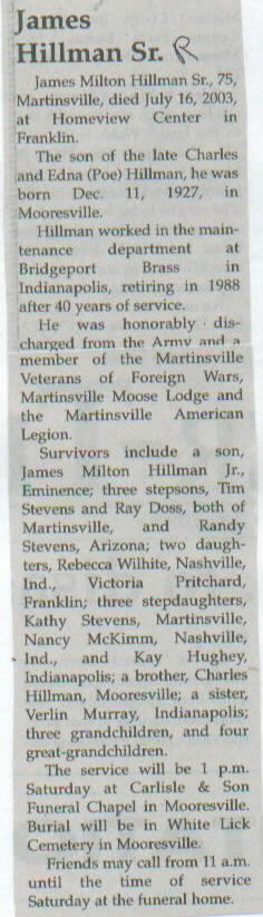 | Survived By | Son, James Milton Hillman, Jr.; 3 stepsons, Tim Stevens, Ray Doss, and Randy Stevens; 2 daughters, Rebecca Wilhite and Victoria Pritchard; 3 stepdaughters, Kathy Stevens, Nancy McKimm, and Kay Hughey; brother, Charles Hillman; sister, Verlin Murray; 3 grandchildren; 4 great-grandchildren. |