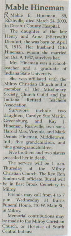 | Survived By | Spouse; 2 daughters, Carolyn Sue Martin and Kay J. Hineman; 2 sons, Harold Max and Mark Dennis Hineman; 5 grandchildren; 9 great-grandchildren. |