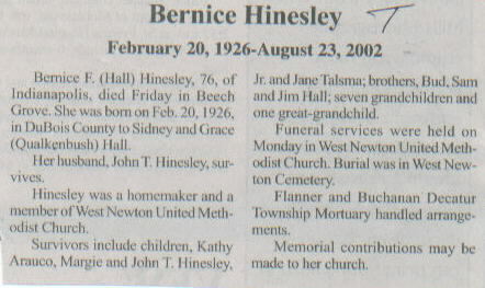 | Survived By | Spouse; children, Kathy Arauco, Margie and John T. Hinesley, Jr., and Jane Talsma; brothers, Bud, Sam, and Jim Hall; 7 grandchildren; one great-grandchild. |