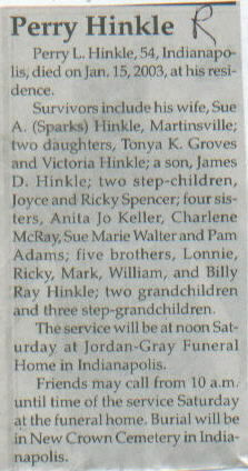 Survived By Widow; 2 daughters, Tonya K. Groves and Victoria Hinkle; son, James D. Hinkle; 2 stepchildren, Joyce and Ricky Spencer; 4 sisters, Anita Jo Keller, Charlene McRay, Sue Marie Walter, and Pam Adams; 5 brothers, Lonnie, Ricky, Mark, William, and Billy Ray Hinkle; 2 grandchildren; 3 stepgrandchildren.