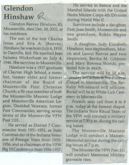| Other | Age 83. Served in Samoa and the Marshal Islands with the United States Marine Corps 4th Division during WW II. Son of the late Charles Jesse and Eva A. (Reeves) Hinshaw. Preceded in death by a daughter, Judy Elizabeth Hinshaw; two stepbrothers, Morris and Lowel Reeves; and two stepsisters, Bertha M. Gibbons and Mary Rowena Shields. |