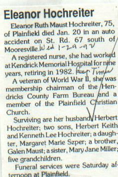 Other Age 75. Funeral at Plainfield. Veteran of World War II. Registered nurse. Worked at Kendricks Hospital for 9 years; retired 1982. Died in an auto accident on State Road 67. Born in Mooresville.