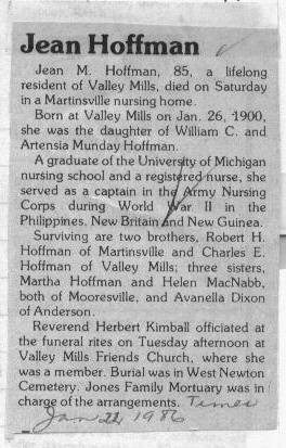 | Other | Age 85. Jones Mortuary (Rev. Herbert Kimball.) Buried West Newton cemetery. Graduate Univ. of Mich. school of nursing. Captain in Army Nursing Corps, WW II, in Philippines, New Britain, and New Guinea. Parents: William C. and Artensia Munday Hoffman. |