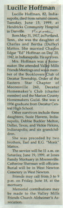 | Other | Age 82. Jones Mortuary (Catherine Sherman officiating.) Buried West Newton cemetery. Parents: Charles and Bertha Duffer Mattox. Graduate Decatur Central HS 1936. Died in Hendricks Hospital; born in Portland. Preceded in death by two brothers, Earl and E. G. ("Monk") Mattox. |
