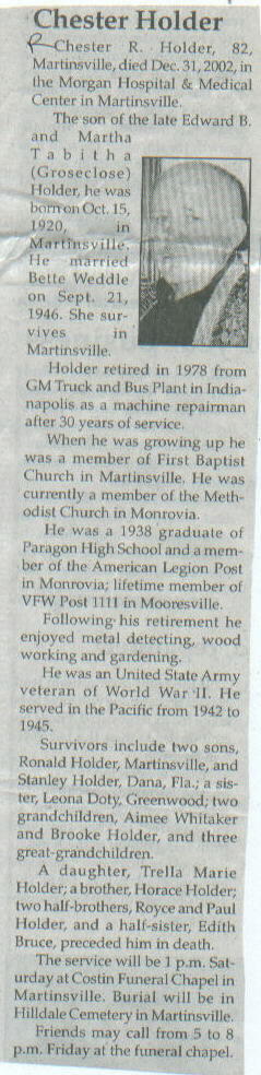 Other United States Army veteran of WW II. He served in the Pacific from 1942 to 1945. Preceded in death by a daughter, Trella Marie Holder; a brother, Horace Holder; two half-brothers, Royce and Paul Holder; and a half-sister, Edith Bruce.