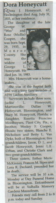 | Survived By | Three sons, Jackie L., Dallas W., and Stacy M. Honeycutt; daughter, Rosetta Francine Moolhuysen; brother, Wesley F. Cooper; 2 sisters, Blanche E. Nicholson and Betty L. Van Dyke; 5 grandchildren, Jason, D. J., and Jacob Honeycutt, Jenni L. E. Urban, and Christie Clark; 2 great-grandchildren. |