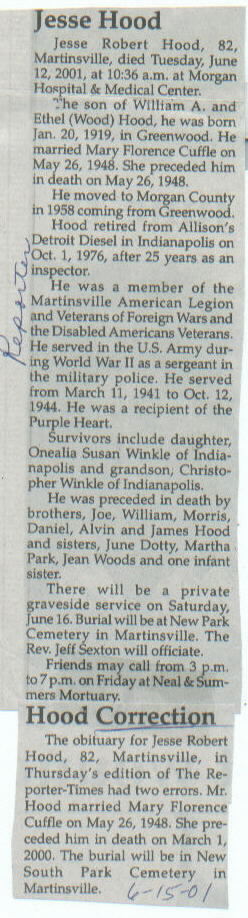 | Other | Preceded in death by spouse; parents, William A. and Ethel (Wood); brothers, Joe, William, Morris, Daniel, Alvin, and James Hood; sisters, June Dotty, Martha Park, Jean Woods, and infant sister. U.S. Army veteran, World War II. |
