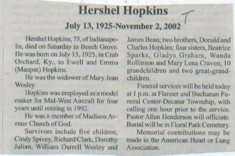 Survived By Five children, Cindy Spivey, Richard Clark, Dorothy Julian, William Darrell Wesley, and James Bean; 2 brothers, Donald and Charles Hopkins; 4 sisters, Beatrice Sparks, Gladys Graham, Wanda Rollinson, and Mary Lena Craven; 10 grandchildren; 2 great-grandchildren.
