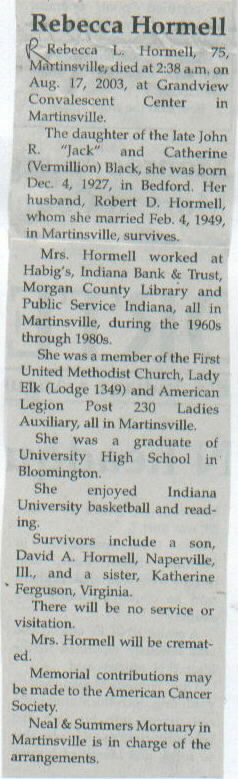 | Other | Age 75. Mrs. Hormell will be cremated. |