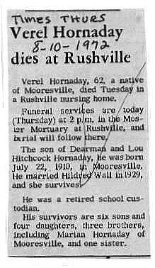 Other Age 62. He was one of the 13 children of Dearman and Lou Hitchcock Hornaday; he was also a twin (brother Vernon died a day after their birth). Married in 1929. Buried in Rushville, Ind.