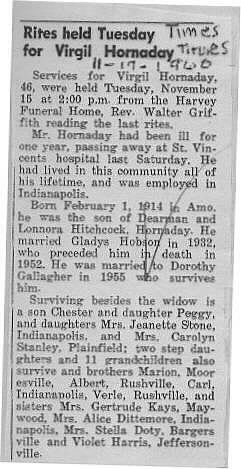 | Survived By | Wife, Dorothy; son, Chester Hornaday; daughters, Peggy, Mrs. Jeanett Stone, and Mrs. Carolyn Stanley; brothers, Marion, Albert, Carl, and Verle; sisters, Mrs. Gertrude Kays, Mrs. Alice Dittemore, Mrs. Stella Doty, and Violet Harris; 11 grandchildren. |