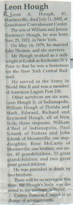 Survived By Widow; 6 sons, Leon, Jr., William, Mark, Edward, Richard, and Raymond Hough; 3 stepsons, William A. Beel, and Paul and John Schenk; stepdaughter, Rose McCarty; brother; sister; 49 grandchildren; 53 great-grandchildren; 2 great-great-grandchildren.