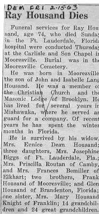 | Survived By | Wife; daughters, Josephine Biggs, Mrs. Priscilla Lambert, and Mrs. Frances Bemiller; brothers, Frank and Glen Housand; sister, Mrs. Mary Housand Knight. |
