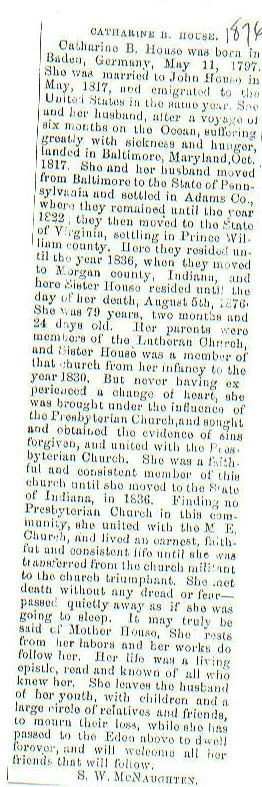 Other Age 79 years, 2 months, and 25 days. Born in Baden, Germany, May 11, 1797. [From the Diary of Elam Harvey for August 6, 1876: "Grandmother House died last night with heart disease. Buried tomorrow at this place."]
