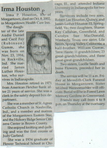 | Survived By | Spouse; 2 sons, Robert Lee and James Luther Houston III; 2 daughters, Sharon Kay Callahan and Carolyn Sue MacDonald; sister, Lila Smith; half-brother, William Gumm; 11 grandchildren; 23 great-grandchildren; 3 great-great-grandchildren. |