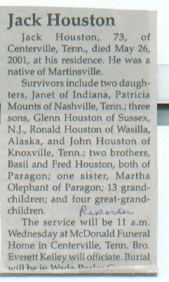 | Survived By | Daughters, Janet and Patricia Mounts; sons, Glenn, Ronald, and John Houston; brothers, Basil and Fred Houston; sister, Martha Olephand; 13 grandchildren; 4 great-grandchildren. |