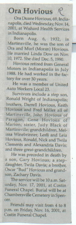 | Other | Preceded in death by spouse; parents, Ora and Murl (Moran) Hovious; son, Gary Hovious; brother, Oscar Hovious; grandson. |